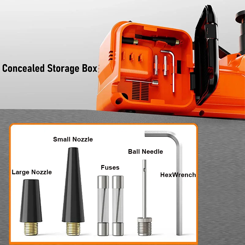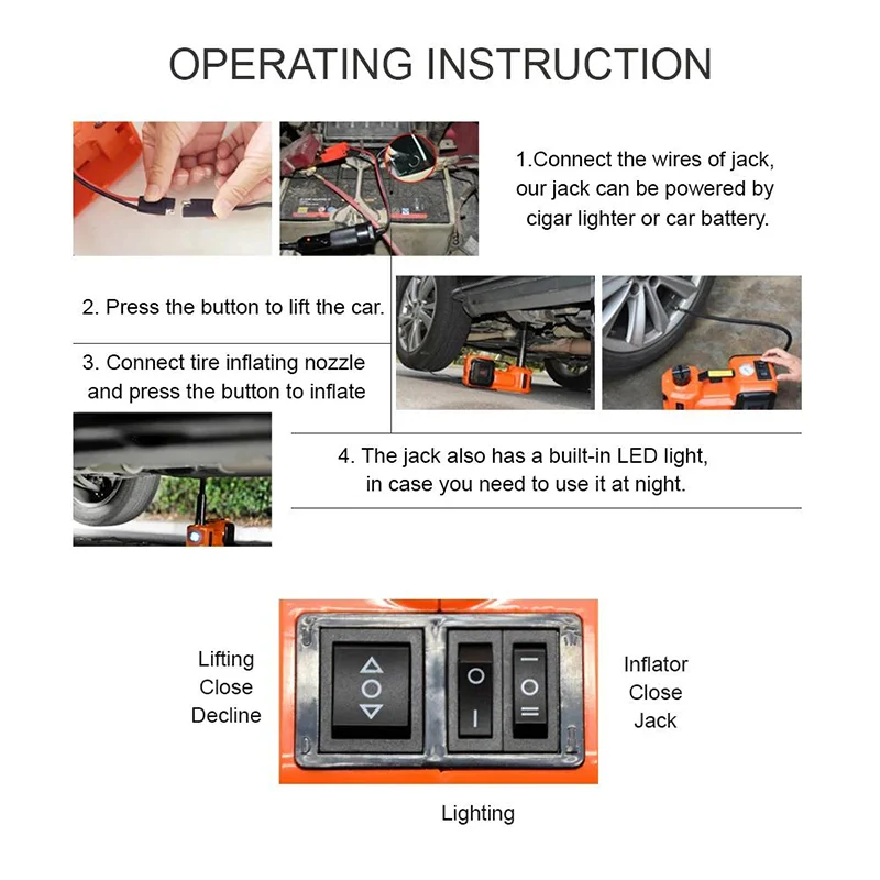 Quick Tire Inflation: With a tire inflator pump installed in the electric hydraulic car jack, there is no need to worry about a tire-broken emergency in the middle of nowhere. Hidden toolboxes on both sides keep the inflatable tube and inflatable needles for quick tire inflation well organized. Equipped with a tire pressure display, you can monitor the tire pressure while pumping. Your car says thank you!