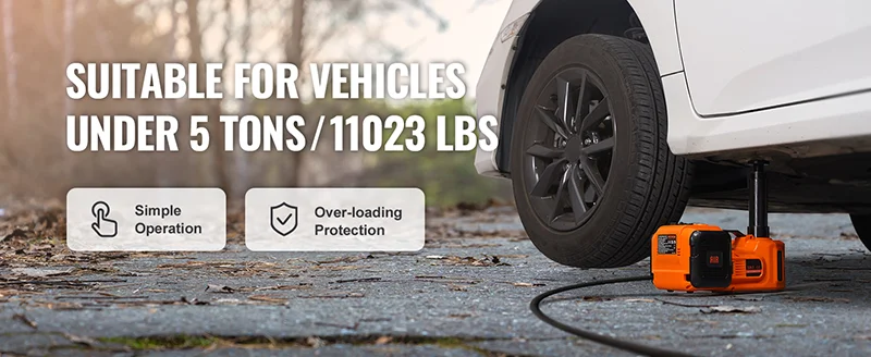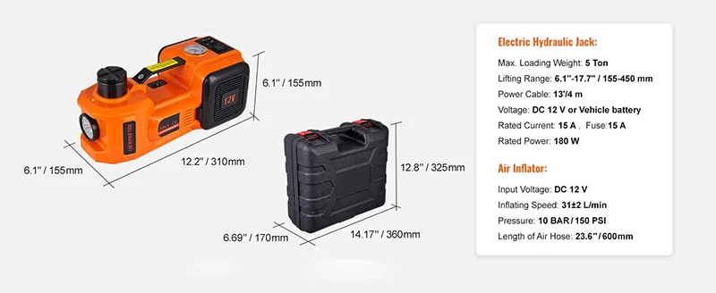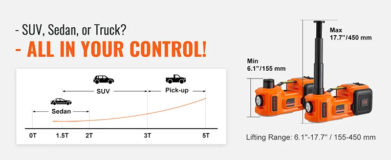 Powerful Electric Car Jack: Lifting capacity: 5.0 tons/11023 lbs. Lifting Range: 6.1''-17.7" / 155-450 mm. This electric car jack kit is a lifesaver during roadside emergencies and can be used for at-home garage repairs. It matches all autos, sedans, SUVs, trucks, or vehicles that suit its capacity.