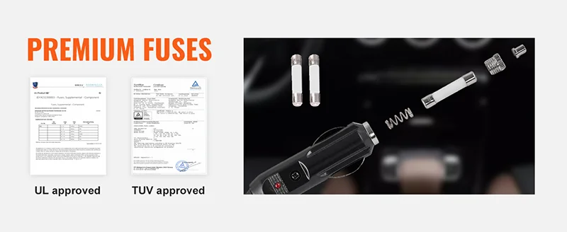 More Than 1 Way to Charge: The electric hydraulic jack for your vehicle can be powered by a 12V cigarette lighter or car battery and equipped with a long 13 feet power cord so you can place it by the front or rear tire without having to think twice. We also provide you with three spare fuses, and our fuses are TUV, and, so you can use them confidently!