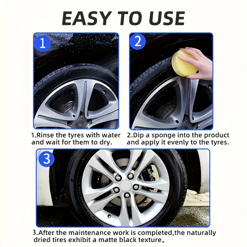 A professional tire polishing wax that restores deep black shine while protecting tires from aging, cracking, and oxidation.