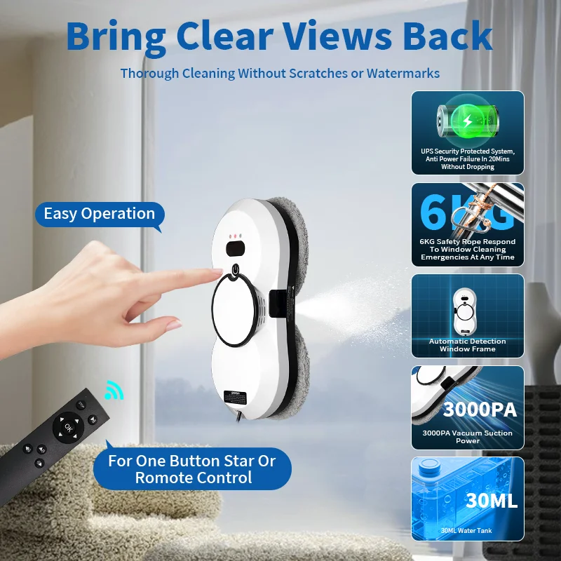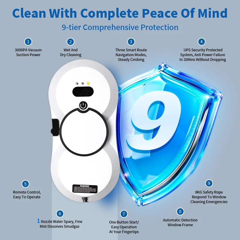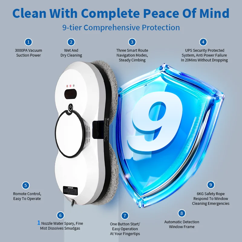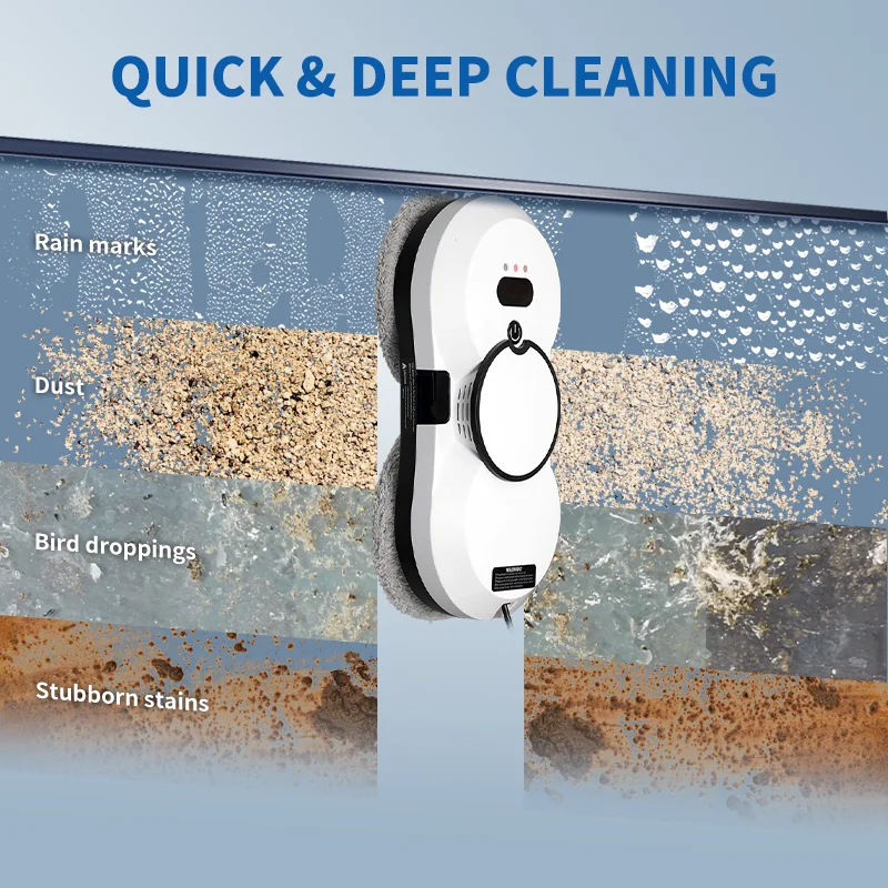 [Superior Suction Power] With a suction power of 5600PA, it firmly adheres to the glass surface, ensuring stable and efficient cleaning! Whether it's a high-rise window or a smooth tile, it effortlessly handles them with complete safety. The powerful suction ensures that no blind angle is left uncleaned, marking the end of the hassle and danger associated with traditional window cleaning. Every window shines like new!